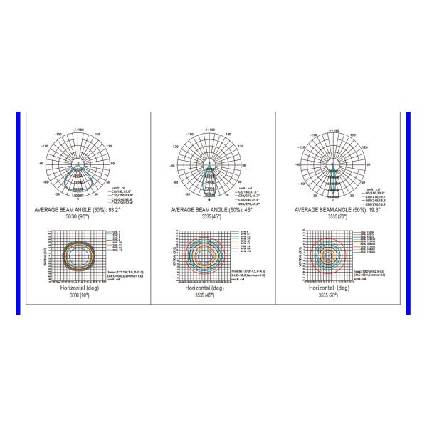 3. Beam Angle: 15°/20°/45°/60°/90°/120°, asymmetric 105°/55°